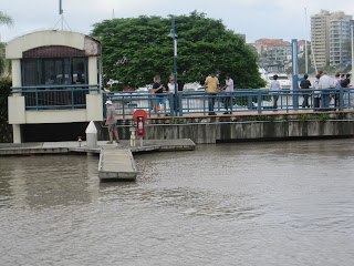 This catamaran was taken from the marina at Kangaroo Point by the owner during the flood and attached to a tree on the boardwalk. The owner said he had seen all the pontoons destroyed and thought that this would save the boat. Unpredictably, the marina survived and this boat was washed right up on the boardwalk where it defied the efforts of many helpers to budge it in the high tide on Thursday.